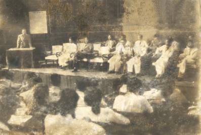 Hồ Chủ tịch nói chuyện với các học viên nhân buổi khai mạc lớp huấn luyện Bình dân học vụ khóa Hồ Chí Minh năm 1945.